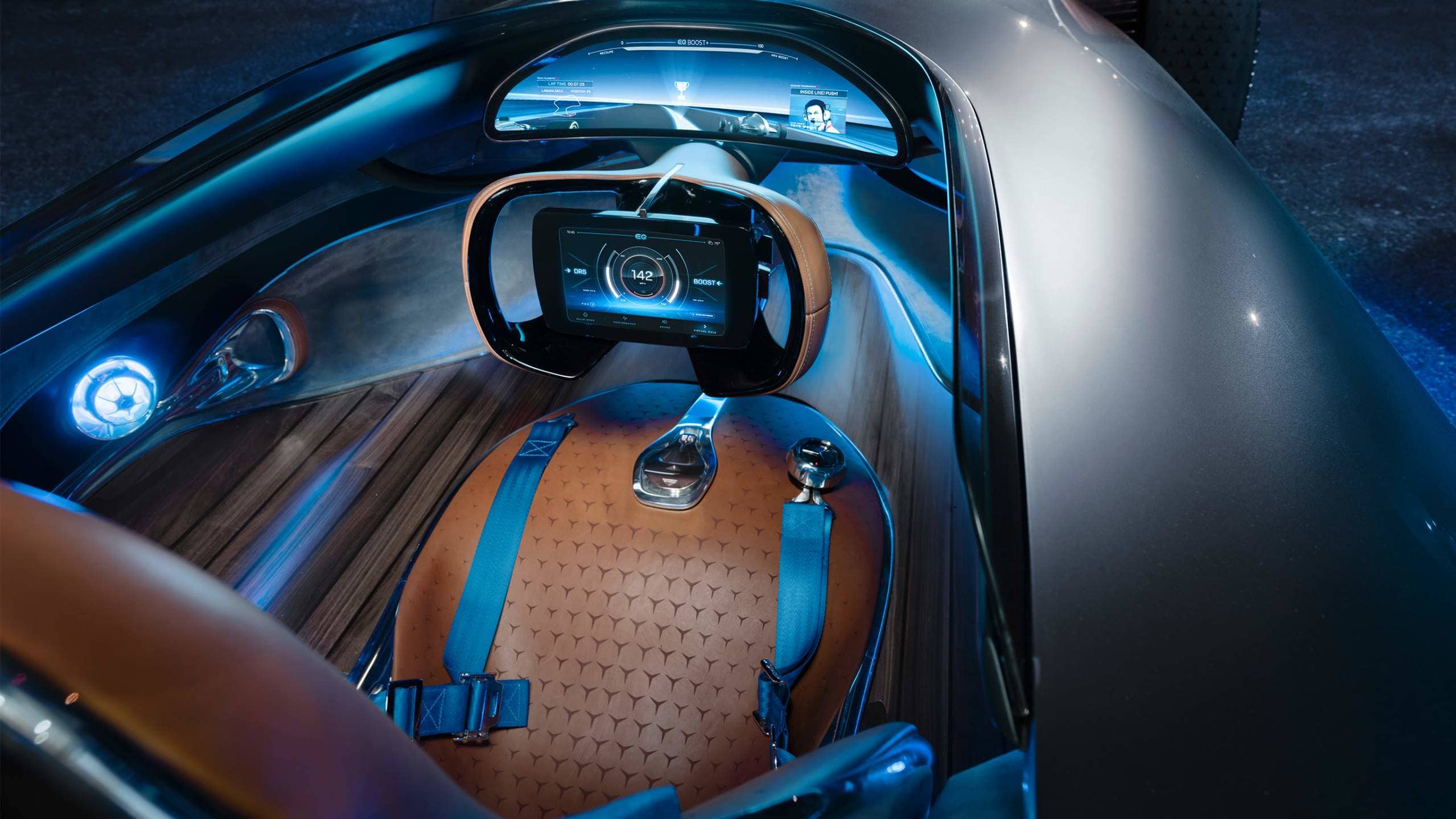 Föraren i Vision EQ Silver Arrow omges av en stor panoramaskärm. På denna projiceras en projektor bakifrån en 3D-bild av omgivningen.