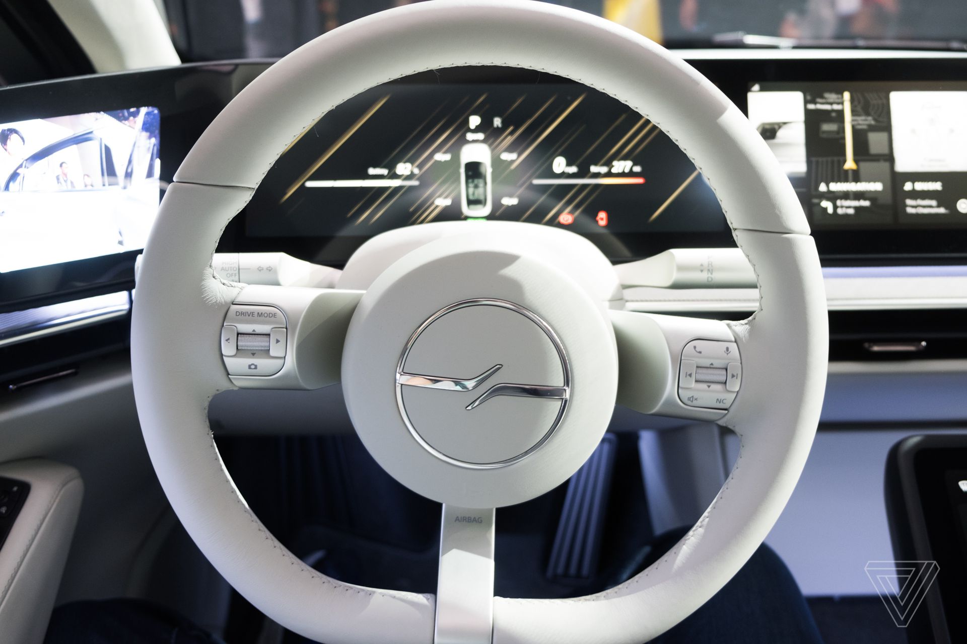 Både mittdisplayen och den displayen som finns framför passagerarsätet är pekskärmar. Det är här föraren och passageraren kan komma åt alla fordonsinställningar, bilens mediekontroller, filmer, musik, plus en flik för spel. Menyanimationerna är flytande, smarta och helt utmärkta. Till exempel med en snabb L-svep längst upp till vänster på mittskärmen flyttar man allt som för närvarande visas till passagerarskärmen: en interaktion som är djupt tillfredsställande. Det finns också mer än ett sätt att interagera med användargränssnittet. En separat styrplatta sträcker sig från mittkonsolen, och den kan användas för att bläddra igenom menyer och kan göra multitouch-gester. Det är också där föraren och passageraren kan ändra bilens klimatkontrollinställningar.